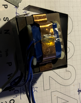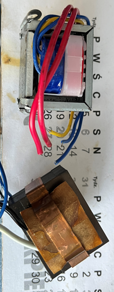 Pomiary wykazały, że napięcie na wyjściu to 9V (symetryczne 9V/0/9V). Kształtka EI41. Samo trafo jest przykręcone poprzez gumowe amortyzatory, osłonięte blachą metalową i ekranowany folią miedzianą.